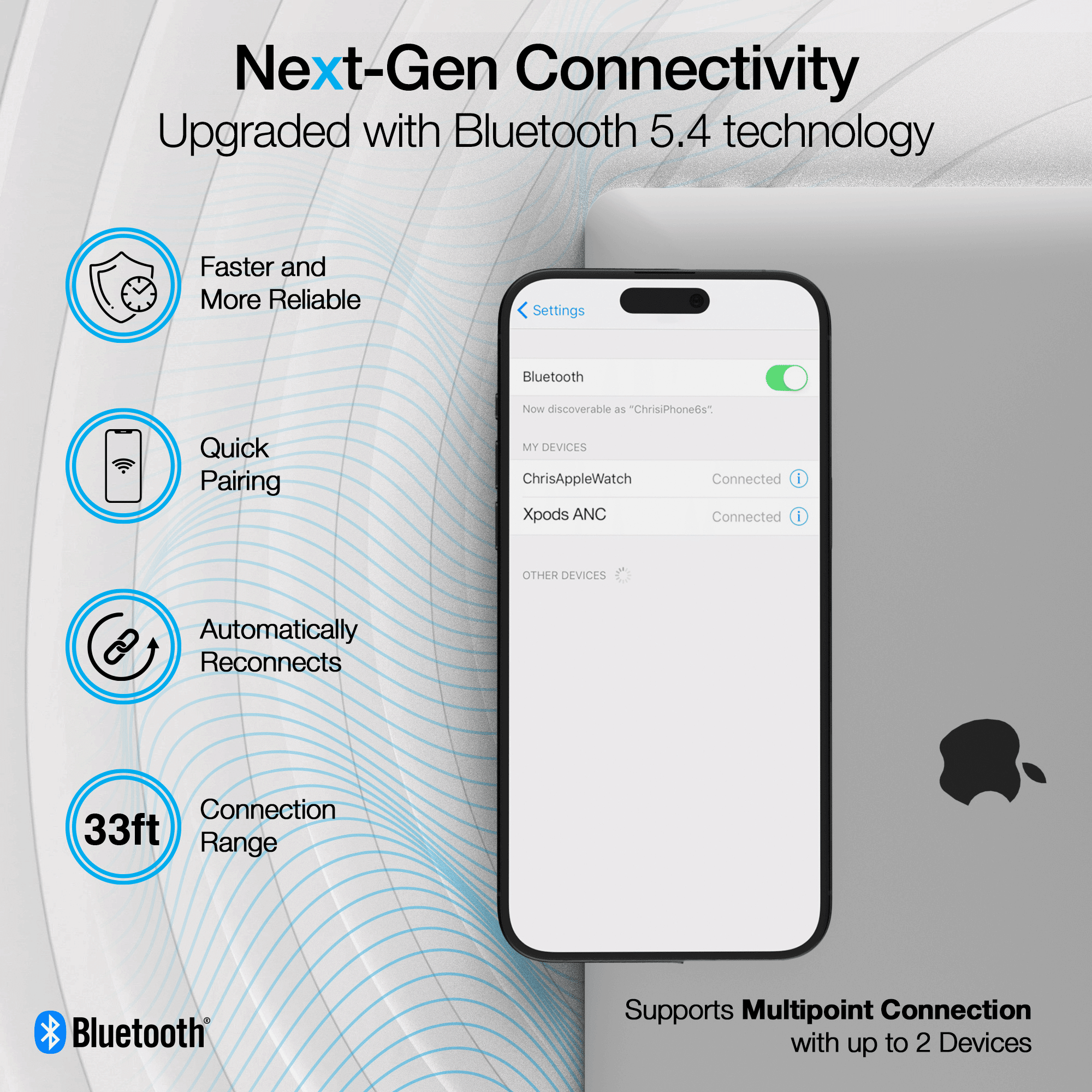 Tune out when you want to, tune in when you need to. All-new from Naztech, the Xpods ANC earbuds feature real-time adaptive Active Noise Cancelling and an Ambient Transparency mode, so you can take total control over your listening experience. Powerful 12mm dynamic drivers deliver the same premium Xpods audio, while the new memory foam ear tips provide an in-ear fit that is more secure and much more comfortable than traditional silicone tips. Get natural-sounding phone call quality thanks to the 4 ENC voice microphones and next-gen Bluetooth 5.4 chipset, which includes support for 2-device Multipoint Connection.