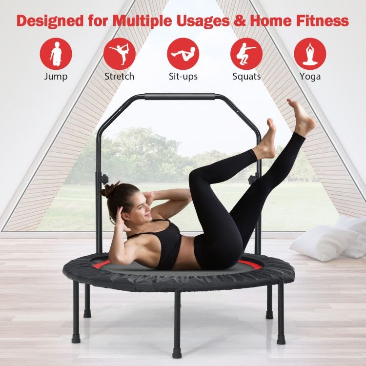 2.Height Adjustable Foam Handrail: The bouncer has 3 different handrail heights to choose from, ranging from 43" to 51". Adults and kids can adjust the handrail to different heights according to their needs to get a better bounce experience. Covered by foam material, the handrail is comfortable and easy to grip.