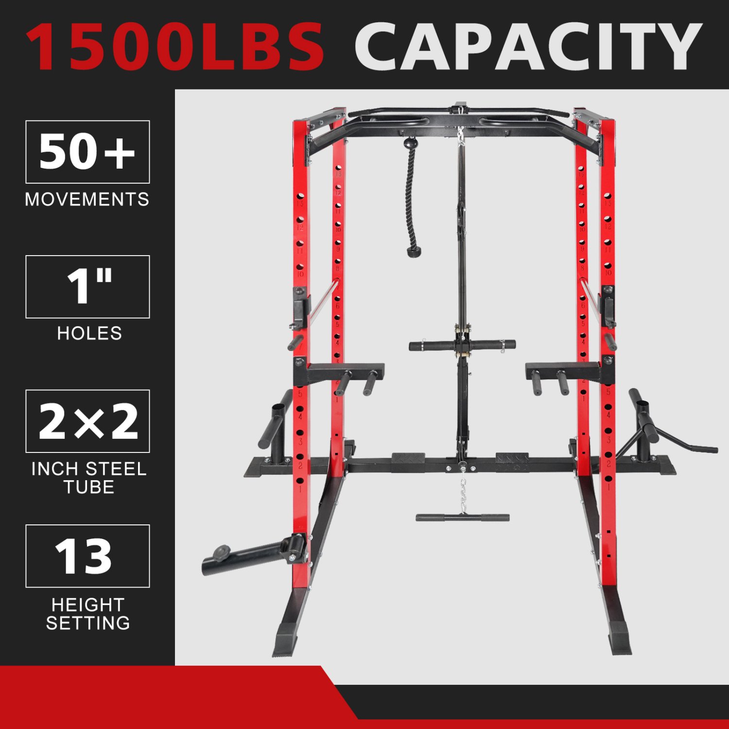 [FULL FUNCTIONALITY] This heavy-duty strength rack system is full of features and accessories, including pull-up bar, T-bar, dip station, straight bar, lat bar, J-hook, bottom pipe hanging tube, bell pad sleeve, spring clip and foot board. 1500 lb. capacity strength cage provides you with the flexibility to perform a wide variety of strength training exercises in a safe environment and in a compact space.