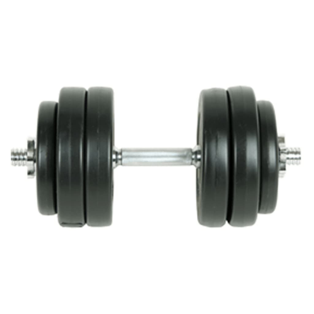 This versatile dumbbell set is perfect for targeting chest, biceps, arms, triceps and back muscles. It includes four 5.5 lb weight plates, two 2.8 lb weight plates and one 5.5 lb dumbbell bar with screw collars and has a total weight of about 33.1 lb. This set allows the users to variably select the weights they want to lift for different exercises.