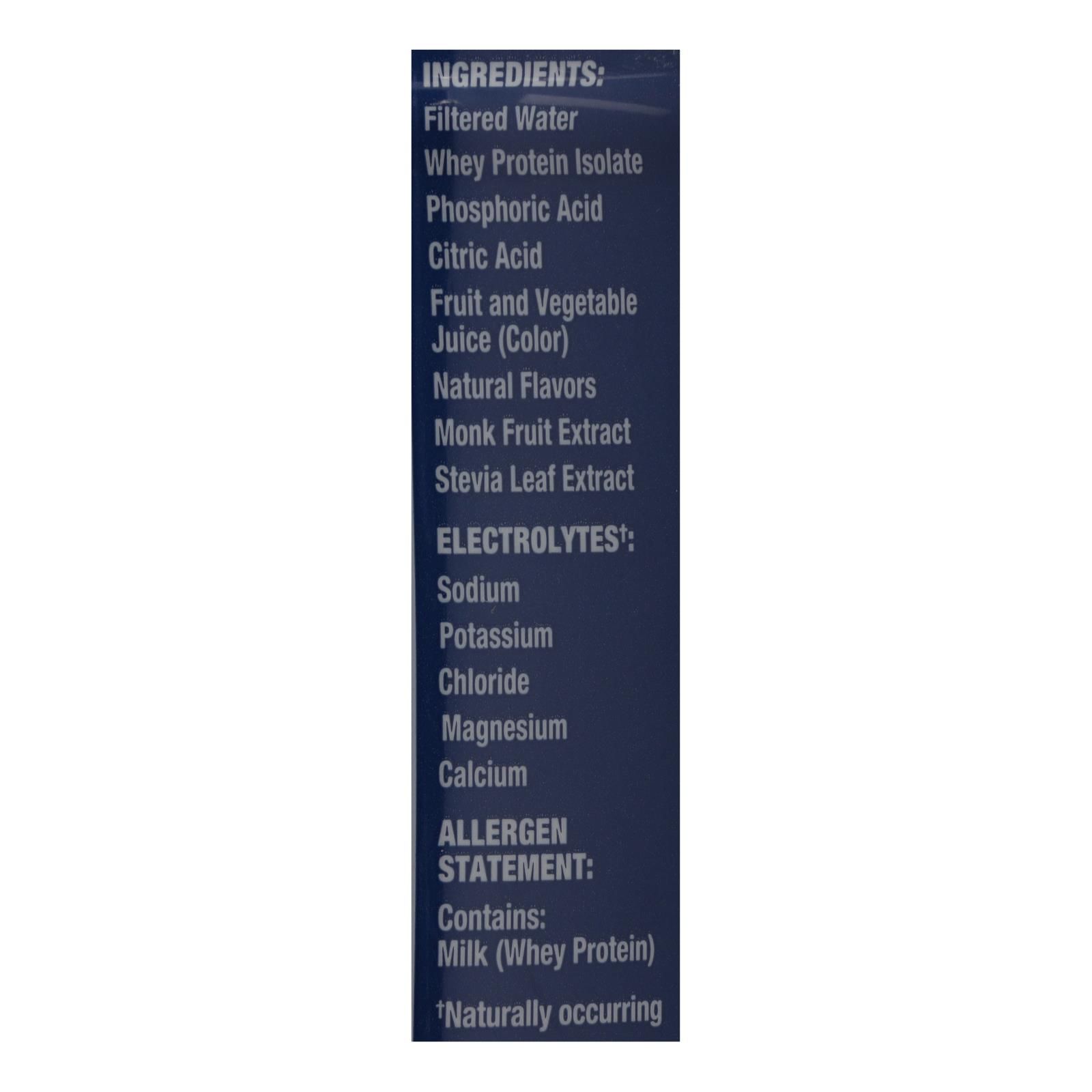 ingredients : electrolytes : sodium potassium chloride magnesium calcium;filtered water whey protein isolate phosphoric acid citric acid fruit and vegetable juice (color) natural flavors fruit and vegetable juice (color) monk fruit extract stevia leaf extract