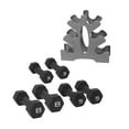 Wipe dumbbells and rack with a damp cloth after use. Store indoors in a cool, dry place. Avoid exposure to direct sunlight or moisture to preserve neoprene coating.